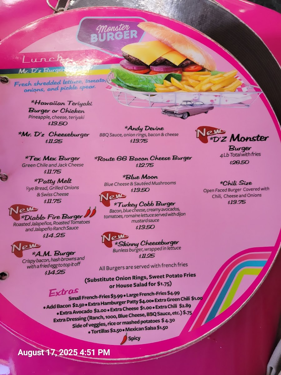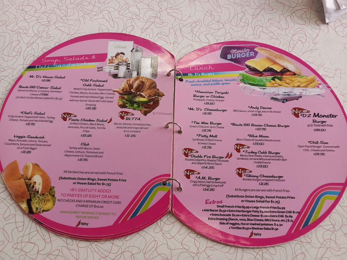 Stepping into Mr D'z Route 66 Diner Menu feels a bit like cruising back in time, where bright neon lights and classic tunes set the mood for comforting, no-nonsense American fare. Located at 105 E Andy Devine Ave in Kingman, this spot keeps things fun and familiar, and the menu reflects that vibe from the very first glance. You’ll notice how everything leans into hearty flavors - from juicy burgers stacked just right to sandwiches that hit the table with that perfect diner-style charm.